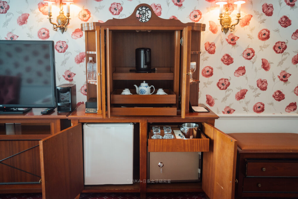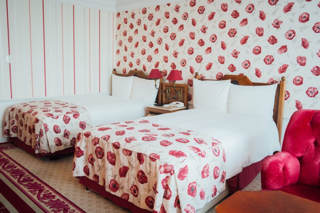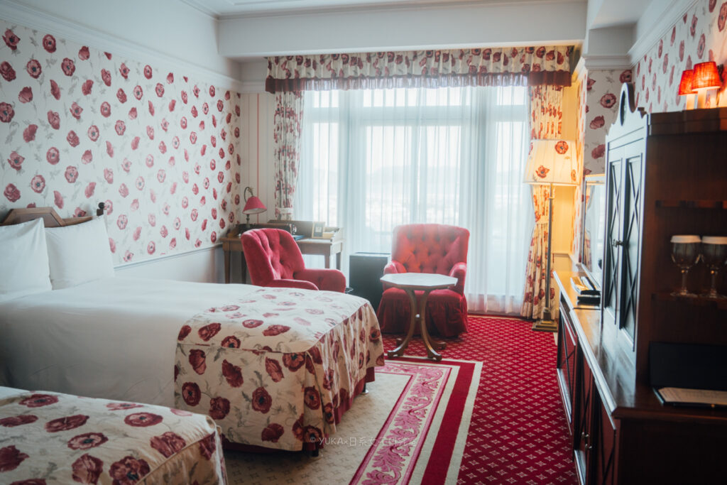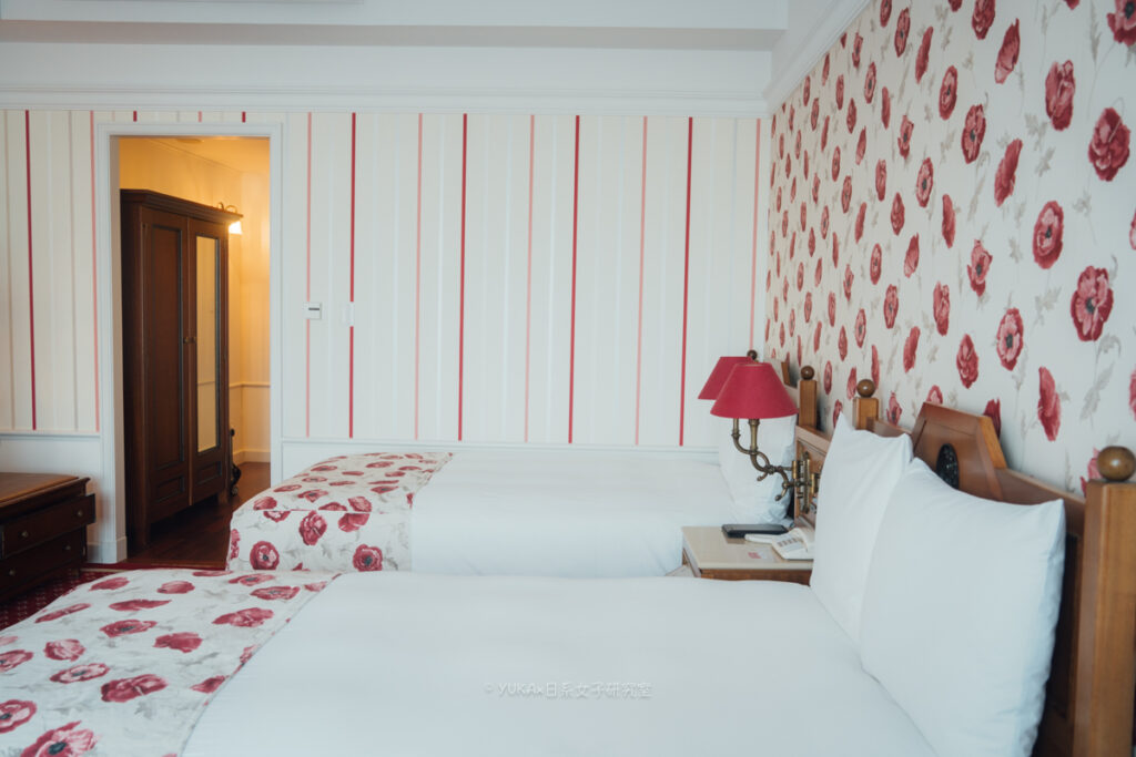 飯店的房型與風格非常多樣,但無論是哪一種,都洋溢著歐式古典浪漫氛圍。我這次入住的是「歐洲風格設計豪華雙床房(ヨーロッパデザイナールーム デラックスツイン)」,室內以古典花卉搭配飽滿色澤的木質傢俱,紅白為基調,典雅卻不落於俗氣。