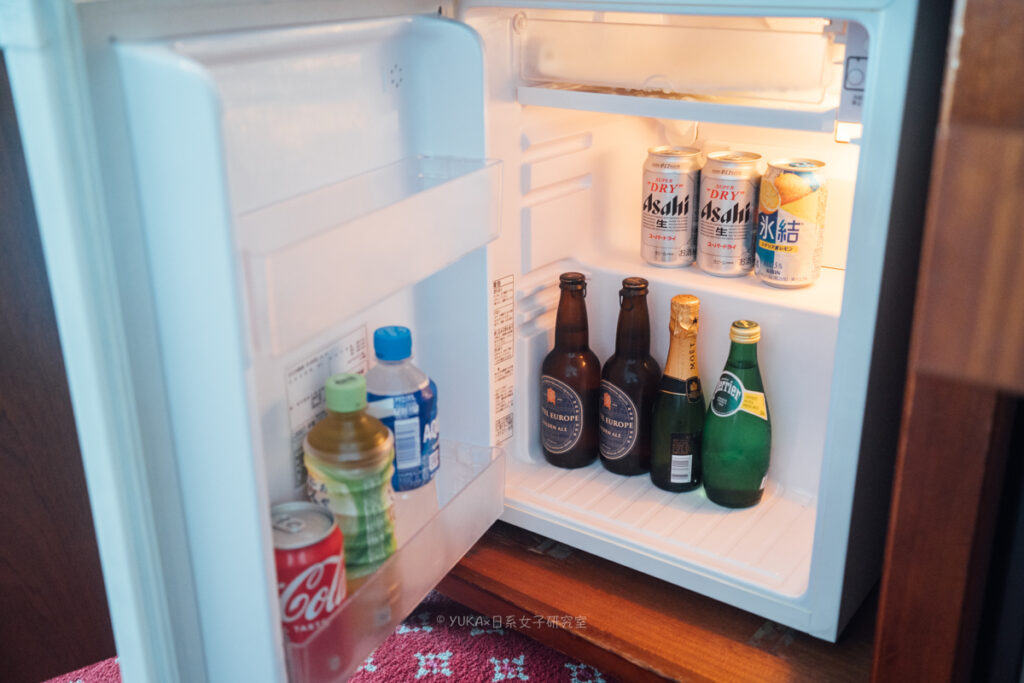 打開冰箱,裡面陳列了種類豐富的含酒精與軟性飲料,但這些都需「另外付費」。不過考慮到飯店距離便利商店較遠,這樣的服務反而顯得貼心與方便。