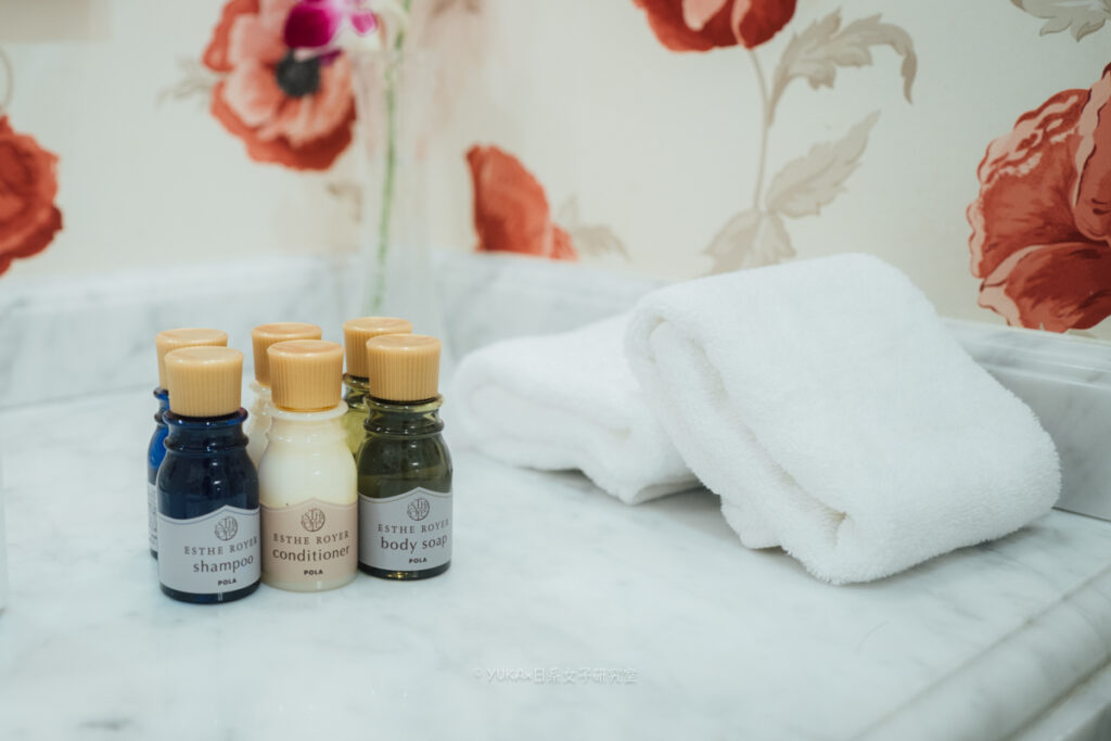 浴室與廁所為分離式,洗手台非常寬廣(只是我沒拍到 XD)。沐浴用品選用日本高級保養品牌 POLA 的 Esthe Royer 系列。