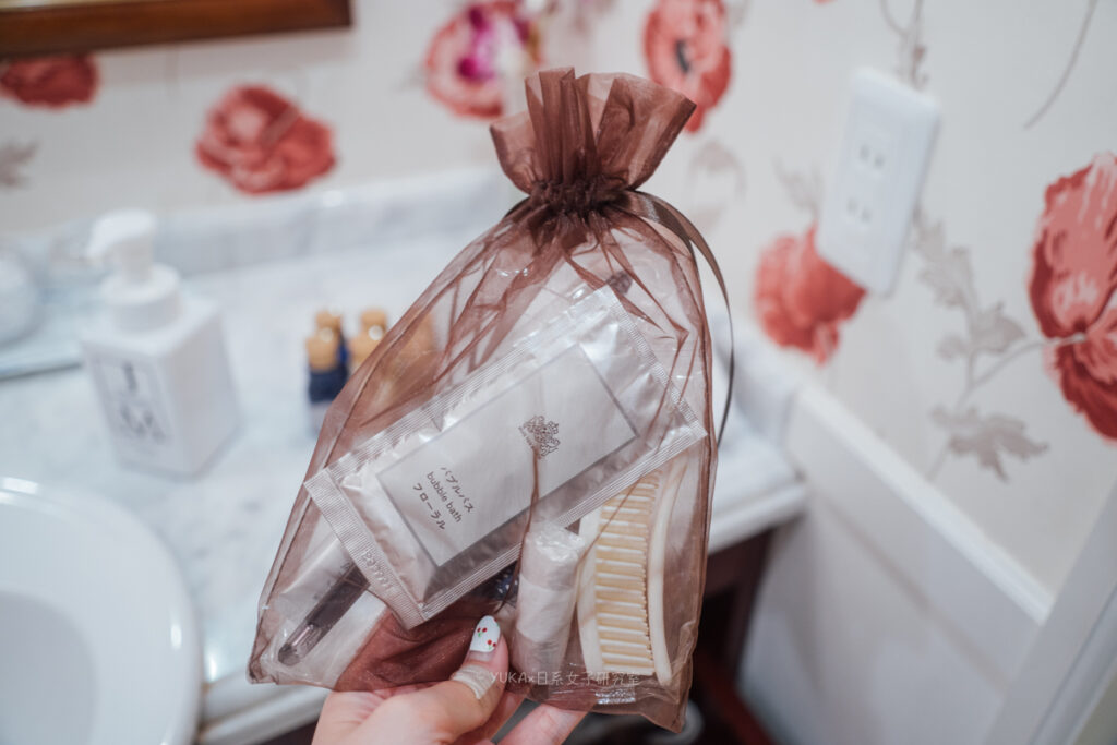 牙刷、梳子、浴帽等其他衛生備品被放在紗質束口袋中。最讓我驚喜的是,裡面竟然還附入浴劑,那天晚上立刻使用,讓淡淡的花香與溫度恰到好處的熱水療癒疲憊的身心。
