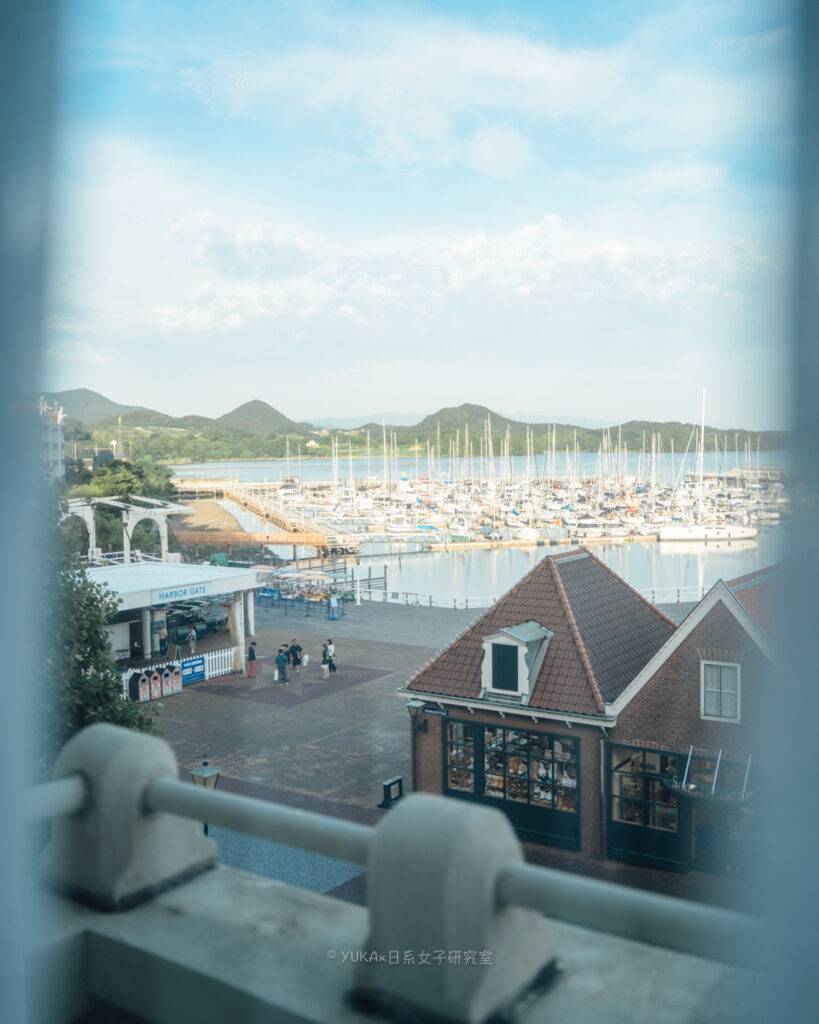 從窗外看出去的景色是豪斯登堡的「港口城」,據說也可以從長崎機場直接搭船來這裡。