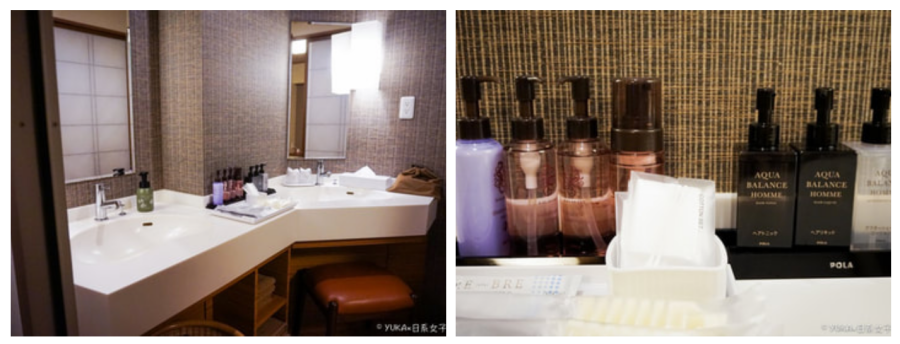 洗手台與化妝台是相結合的,總共有兩個,超適合我們這種一早起來要化妝的女生「們」,不用為了鏡子等來等去的。另外,旅館提供的盥洗用具非常齊全,不只基本的洗髮精、沫浴乳、潤髮乳、洗面乳,還有化妝水、乳液、卸妝油,甚至還有養髮液、順髮液!怎們那麼貼心啦~~(有的我甚至平常也沒用過XD)