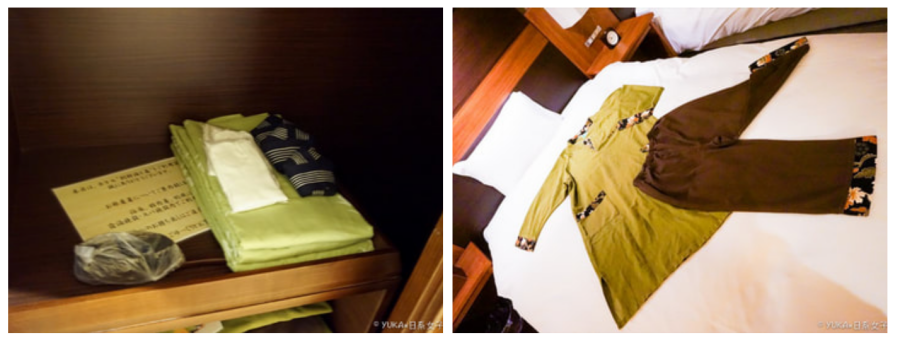 許多人泡湯,都會習慣換上旅館提供的衣服,而太陽之里的房內有提供兩種服裝,第一種是大家最熟悉的浴衣(左圖),而另一種……我也不知道叫什麼(笑),很像是做SPA的衣服之類的我猜。