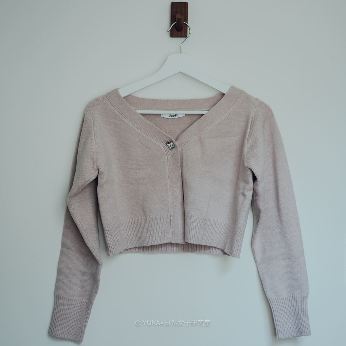 偶粉色的短版針織外套,是SNIDEL的經典款式,鑽扣的使用更提升了氣質感~搭配第一件的碎花洋裝會顯得身材比例很好!